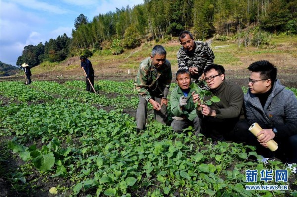 11月23日,福建南平市農(nóng)技員江鑫(右二)與紀委下派駐村干部陳瑞輝(右一)在延平區(qū)南山鎮(zhèn)前村指導(dǎo)貧困農(nóng)民種植油菜,增加冬季收入。