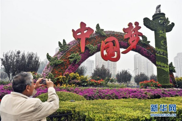 2013年9月30日,一名行人在北京復(fù)興門橋拍攝“中國夢”主題花壇。