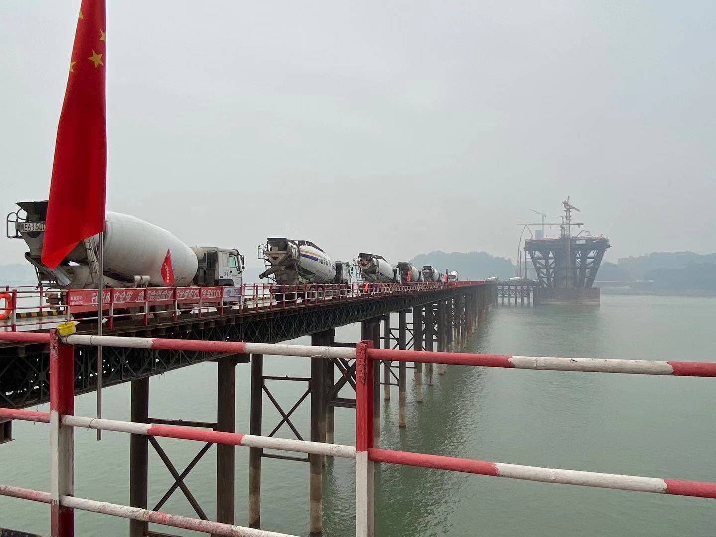 建材科技公司近期為正橋工程橋跨承重結(jié)構(gòu)斜拉橋的主梁拉索支架上澆筑混凝土主梁MP4段混凝土主梁供應(yīng)建科混凝土